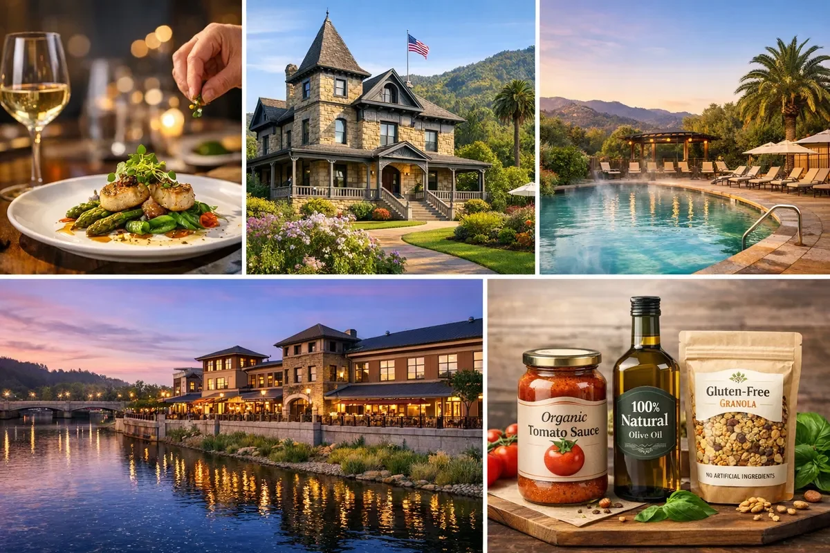 Yountville gastronomy scene, St. Helena heritage architecture, Calistoga hot springs, Napa riverfront at dusk.