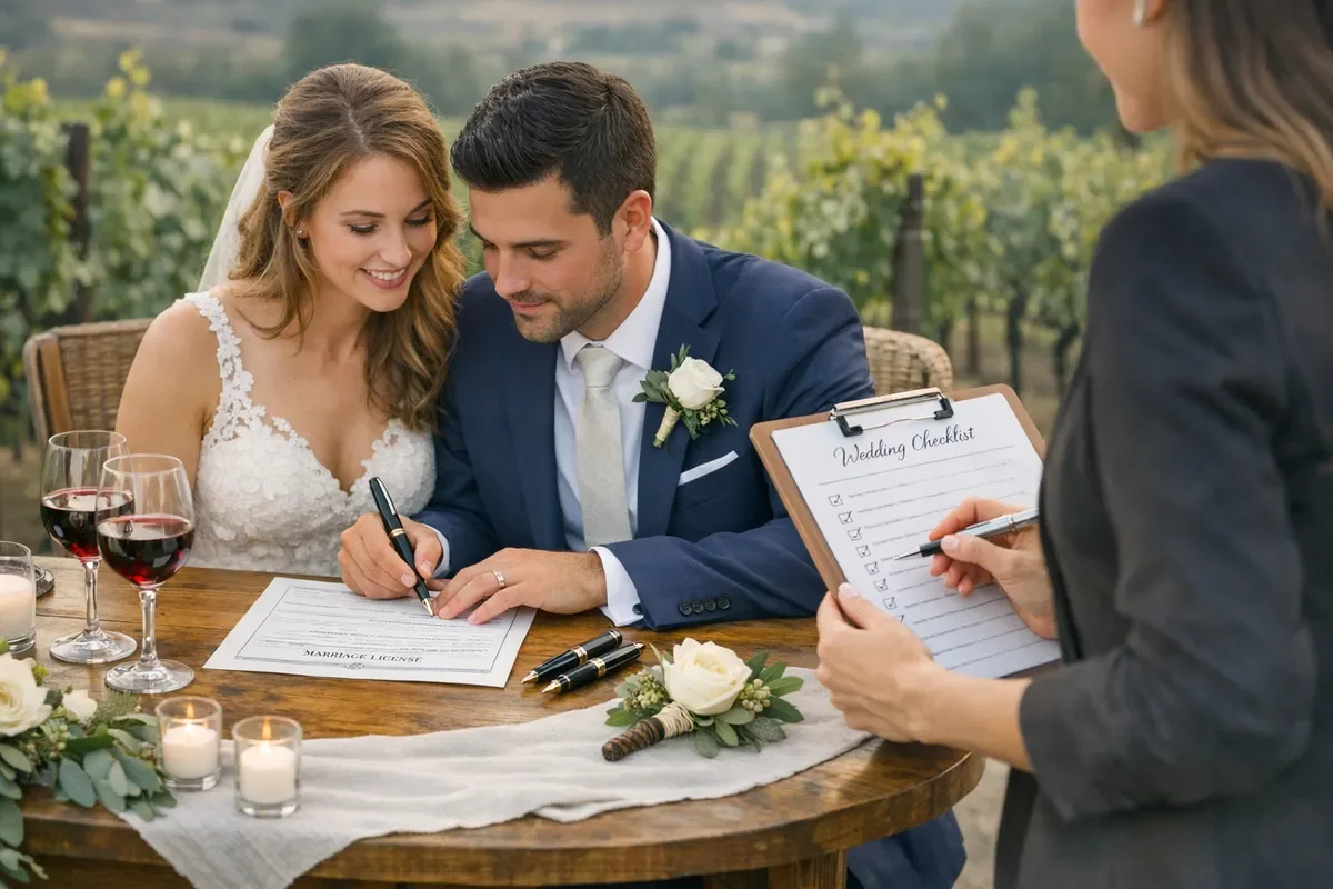 Couple signing marriage license at a vineyard sweetheart table, planner nearby with checklist, fountain pens, wine glasses and boutonniere on linen.